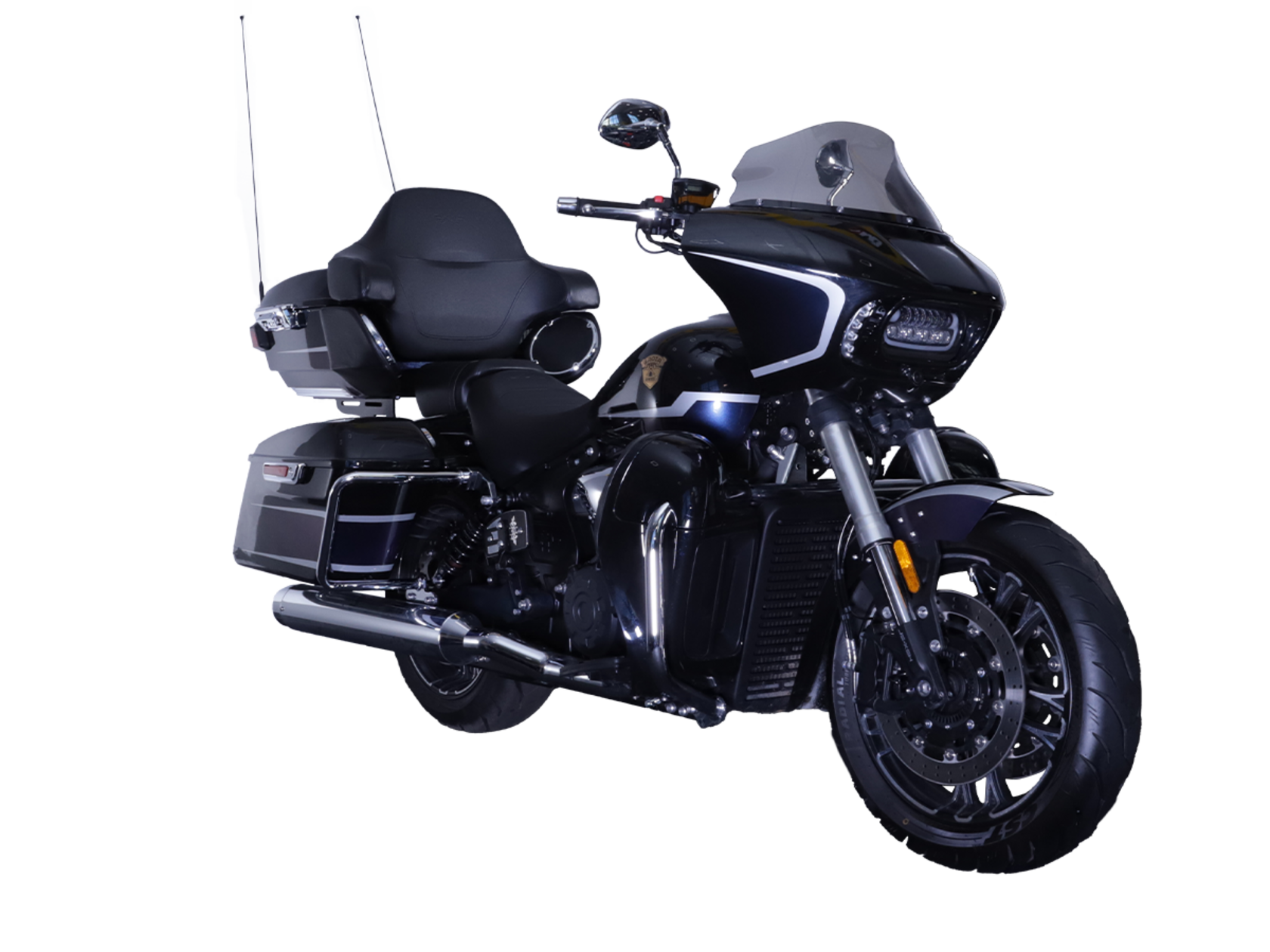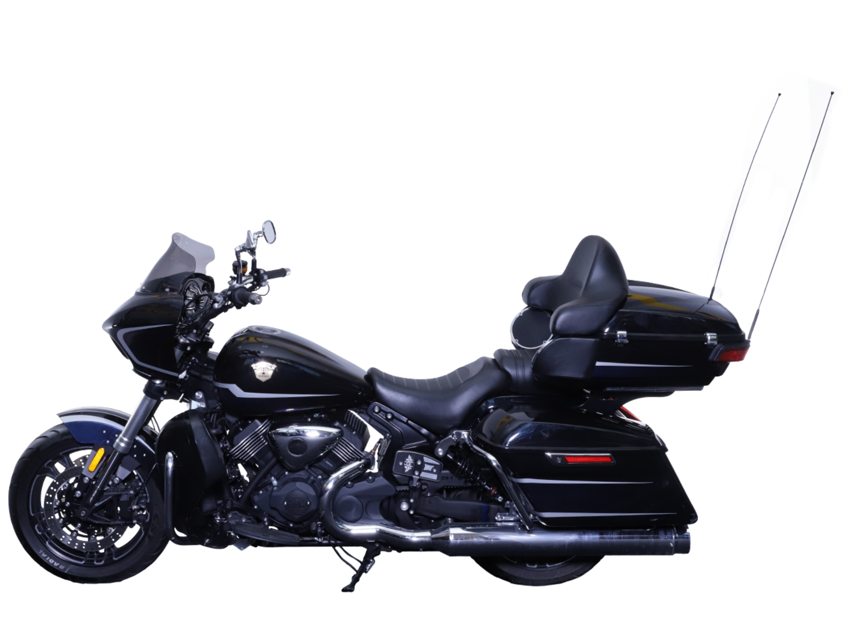 GROZA Traveller 800 – роскошный круизёр, который создан для суперкомфортного перемещения на любые расстояния. Он имеет современный, брутальный дизайн с мощным обтекателем, характерной светодиодной головной оптикой и монументальными хромированными глушителями.Двухцилиндровый V-образный двигатель объёмом 800 см3 мощностью 61 л.с. при высоких показателях динамики и отличном крутящем моменте способен разгонять аппарат до 160 км/ч. Привод на ведущее колесо осуществляется ремнём знаменитой марки USA Gates. Жидкостная система охлаждения не допустит перегрева мотора даже на самых непростых маршрутах.На мотоцикл установлены литые алюминиевые диски диаметром 17 дюймов. Ширина передней покрышки – 140 мм, задней – 200 мм. С неровностями дороги эффективно справляются телескопическая вилка перевёрнутого типа спереди и маятник с двумя амортизаторами сзади. Вилка имеет 7 ступеней регулировки, что обеспечивает лёгкую перестройку на различные режимы езды. Для всего класса круизёров такая опция – большая редкость. Эффективное и безопасное замедление с любых скоростей обеспечивают гидравлические дисковые тормоза спереди и сзади от компании NISSIN.Мотоцикл оснащён мощной музыкальной системой с четырьмя 6,5-дюймовыми динамиками, двумя штатными видеорегистраторами спереди и сзади, тремя грузовыми кофрами общим объёмом 120 литров, развитой спинкой для пассажира, массивными дугами и “валенками”, снабжёнными открывающимися вентиляционными шторками и небольшими грузовыми ёмкостями. Из других приятных мелочей в допоборудовании мотоцикла стоит выделить подогрев ручек, датчики давления в шинах и USB-порт.Мотоцикл сочетает в себе отличные технические характеристики, богатое оснащение, комфорт и надёжность, что позволяет вам ощутить настоящую свободу, отправившись на нём в любое путешествие.