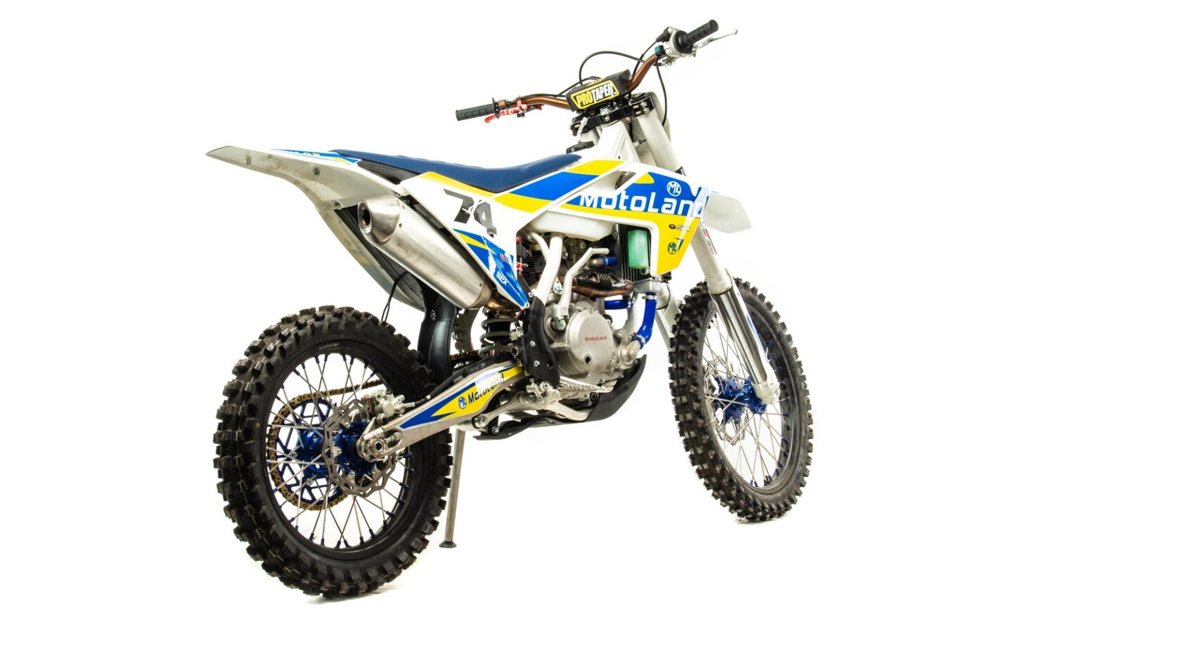 Мотоцикл Motoland XT300 STНадёжная техника оснащенная двигателем 174FMN-3 с водяным охлаждением. с кикстартером и электростартером, Мощностью 26 Л.С. на двигателе установлен Карбюратор NIBBI n34 с ускорительным насосом.Это полноразмерный кроссовый мотоцикл его база по осям составляет 1400 мм., и габаритами 2100х800х1120 мм. Высота по седлу составляет 950 мм. Передние и задний амортизаторы с регулировками.За счет сбалансированной базы мотоцикл имеет отличную управляемость, а конструкция рамы и особенности настройки подвески GPX способствуют максимальному поглощению неровностей дорожного покрытия, а так же усиленная прогрессия на игольчатых подшипниках. Алюминиевые обода c антибуксаторами, усиленными спицами и ступицами.На кроссовой резине 80/100-21 / 110/100-18На мотоцикле установлена обновлённая тормозная система обеспечивающая отличные тормозные характеристики. Глушитель с уникальным дизайном прямоточного типа, полностью алюминиевый для облегчения веса.