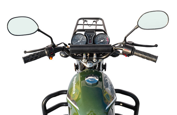 Комплектация Тормозная система – два барабанных тормоза. Усиленные тросы переднего тормоза и сцепления. Кроме того, на Regulmoto Alpha (RM-3) установлены зеркала заднего вида, подножки для пассажира, багажный кофр, пластиковые бардачки, кожух защиты цепи и дуги безопасности.