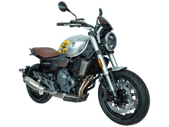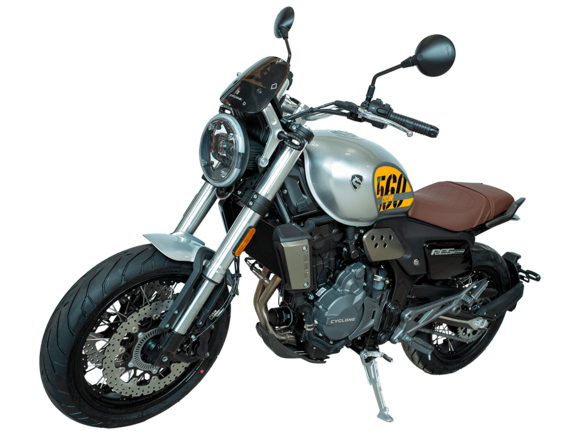 CYCLONE RE5 (SR600) – классик, в котором брутальная простота объединяется с современными технологиями. Данная модель является самой крупнокубатурной среди классических мотоциклов компании CYCLONE.Двухцилиндровый четырёхтактный двигатель объёмом 550 см3 выдаёт 60 л.с. на 8500 об/мин. Максимальный крутящий момент достигается на 6500 об/мин и составляет 55 Н·м. Инжекторный впрыск топлива с блоком управления BOSCH увеличивает топливную экономичность, а также позволяет добиться высокой приёмистости и неприхотливости агрегата. Жидкостная система охлаждения не допустит перегрева двигателя даже при самом агрессивном вождении. На мотоцикл установлена 6-ступенчатая механическая коробка передач.Максимальная скорость мотоцикла составляет 170 км/ч.RE5 оснащён классическими спицевыми колёсами диаметром 17 дюймов. Колёса обуты в бескамерные покрышки от легендарной фирмы PIRELLI. С неровностями дороги эффективно справляются телескопическая вилка перевёрнутого типа спереди и маятник с моноамортизатором сзади. Ход передней подвески составляет 120 мм, задней – 50 мм. Оба компонента подвески являются регулируемыми. Эффективное и безопасное замедление с любых скоростей обеспечивают гидравлические дисковые тормоза с ABS спереди и сзади. Тормозные системы произведены известной испанской фирмой J.JUAN (входящей в легендарный холдинг BREMBO).Клиренс мотоцикла составляет 155 мм. Объём топливного бака – 20 л. Снаряжённая масса – 204 кг.Из дополнительного оборудования можно выделить USB-порт и датчики давления в шинах.Мотоцикл сочетает в себе отличные технические характеристики, комфорт и надёжность, что позволяет вам ощутить настоящую свободу на любой дороге.