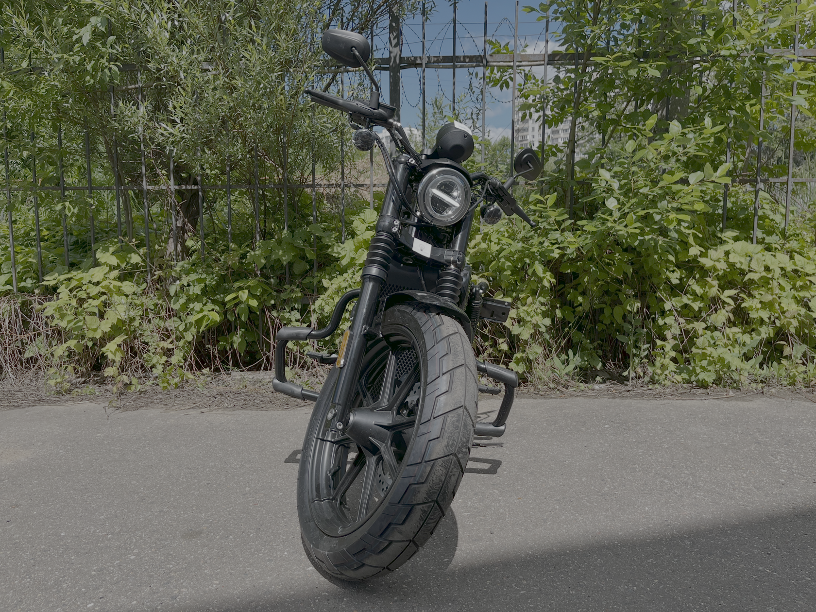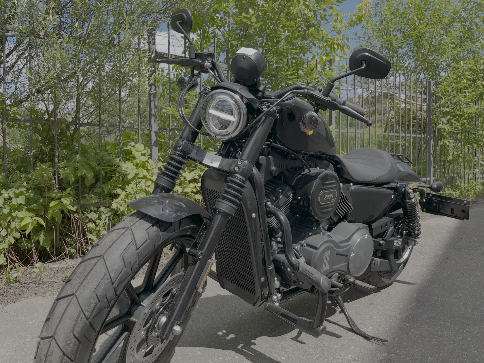 GROZA Toughman 800 – суровый и брутальный круизёр, который сразу обращает на себя внимание в потоке своей схожестью с кастом-байком: спартанской простотой с монохромной гаммой, олдскульными элементами, изящно оформленным двигателем, великолепной выхлопной системой и широченной задней покрышкой.Двухцилиндровый V-образный двигатель объёмом 800 см3 мощностью 61 л.с. при высоких показателях динамики и отличном крутящем моменте способен разгонять аппарат до 160 км/ч. Инжекторный впрыск топлива с инжектором DELPHI увеличивает топливную экономичность, а также позволяет добиться высокой приёмистости и неприхотливости агрегата. Привод на ведущее колесо осуществляется ремнём знаменитой марки USA Gates. Жидкостная система охлаждения не допустит перегрева мотора даже при самом агрессивном вождении.Аппарат имеет 6-ступенчатую механическую коробку передач с классической схемой “1-N-2-3-4-5-6”. На мотоцикл установлены литые алюминиевые диски диаметром 19 дюймов спереди и 17 дюймов сзади. Ширина передней покрышки – 130 мм, задней – целых 240 мм! С неровностями дороги эффективно справляются телескопическая вилка спереди и маятник с двумя газонаполненными амортизаторами сзади. Эффективное и безопасное замедление с любых скоростей обеспечивают гидравлические дисковые тормоза спереди и сзади.Байк обладает внушительным дорожным просветом 160 мм, что позволяет, при желании, съезжать на дороги с худшим покрытием, нежели асфальт. Зеркала не выходят за габариты руля, что позволяет комфортно проезжать на нём в междурядье.Мотоцикл сочетает в себе отличные технические характеристики, комфорт и надёжность, что позволяет вам ощутить настоящую свободу на любой дороге.