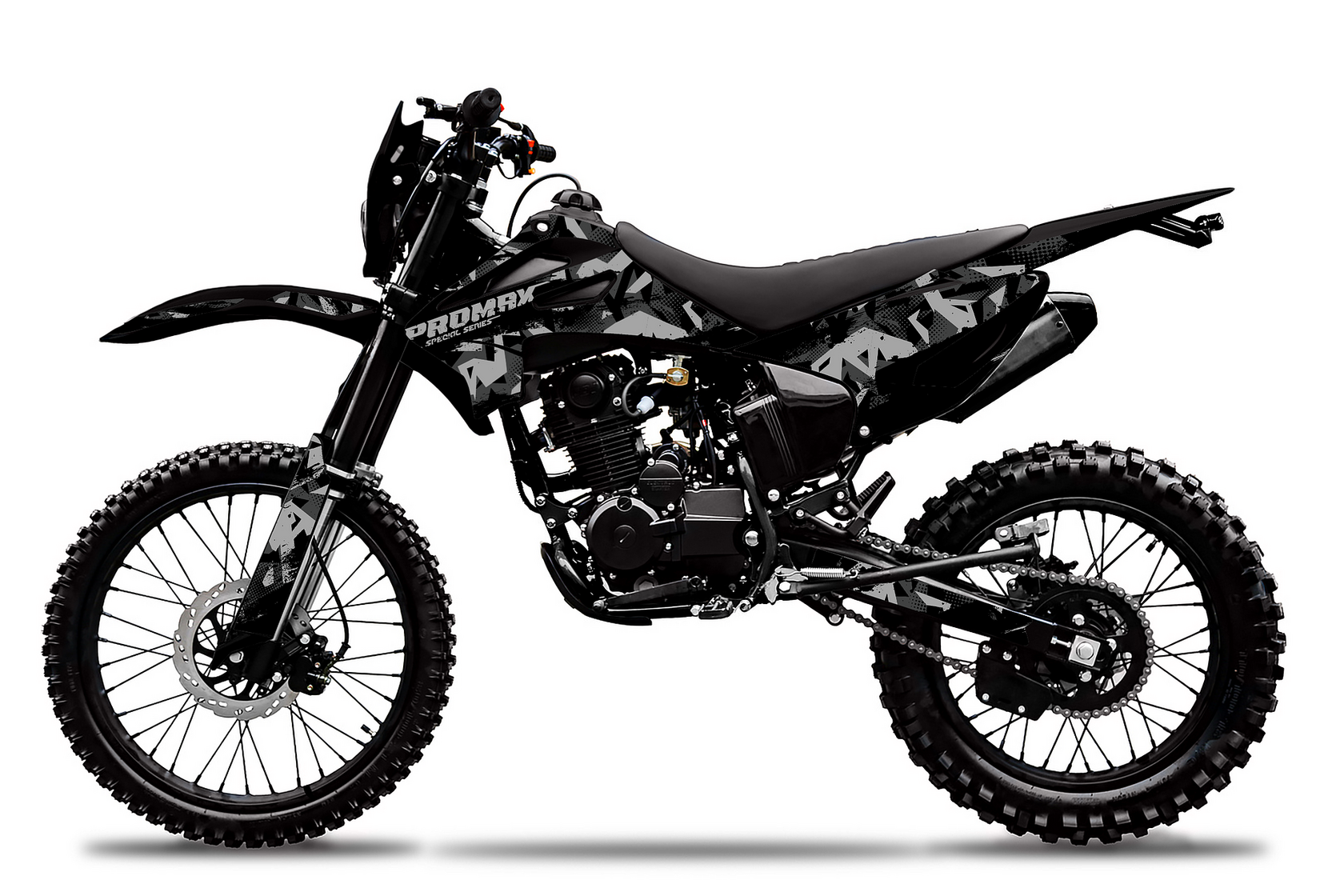 Мотоцикл PROMAX ARMY создан специально для выполнения сложных задач. Максимально облегченная конструкция выдерживает 2-х (двух) взрослых людей. Скрытный, черный дизайн. Тихая выхлопная система. Используется минимум электрики и дополнительных аксессуаров, основная цель НАДЕЖНОСТЬ!Для увеличения надежности и облегчения веса, в мотоцикле реализованы следующие технические решения:Хромомолибденовая рама с защитойРама изготовлена с упором на надежность и долгий срок службы. Все узлы тщательно проварены, есть дополнительные усиления. На раму установлен пластиковый каркас, который защищает мотоботы и раму. Алюминиевый маятник KTM для сбалансированного веса и большей прочности.Спортивные облегченные колеса 21/18Надежная тормозная система ANJIE (дочернее предприятие BREMBO)Двухпоршневой суппорт спереди и однопоршневой сзади от производителя тормозных систем ANJIE, в сочетании с колодками, изготовленными из керамического материала, обеспечивают высокий коэффициент трения и эффективность торможения даже при высоких температурах дисков. Сами же диски толщиной 4мм – гарантия безопасности и плавной остановки.Комфортное сидение PROMAXФирменное нескользящее сиденье PROMAX, выполненное по технологии anti-slip grip, держит любого райдера как суперклей: специальное ребристое водонепроницаемое покрытие позволяет чувствовать себя комфортно в любых погодных условиях.Галогеновое освещениеКороткоходная ручка газаРучка газа с коротким ходом от Nibbi Racing – пожалуй лучшее решение на подъемах и труднопроходимых участках. Нет нужды перехватывать ручку для получения большей мощности, достаточно подобрать необходимое усилие кисти и получить результат, оптимальный для стиля езды райдера!Приводная цепь Choho.Цепь Choho отличается от других большим запасом прочности, благодаря уплотнительному кольцу удерживающему смазку внутри и не пускающему пыль снаружи, предотвращая растяжение и низким уровнем шума – идеальное сочетание для тех, кто хочет как можно реже обслуживать технику и как можно больше эмоций получить!Фрезерованные траверсы CNC:Изготовленные из авиационного алюминия 7075, легкие и прочные траверсы выдерживают большие нагрузки. Система настройки положения руля "ближе-дальше" позволяет настроить удобное положение руля в стойке.ПодвескаПодвеска MNT, с диаметром пера в 41 мм, в заводской форме обладает широчайшими возможностями настройки, которых не представит ни один конкурент! При помощи внешних регуляторов и легко настраиваются прямо на трассе. Диапазон их настроек таков, что можно с утра посетить жестокую кроссовую трассу, а вечером лайтово прокатиться на природе - и иметь полный комфорт в обеих поездках.
