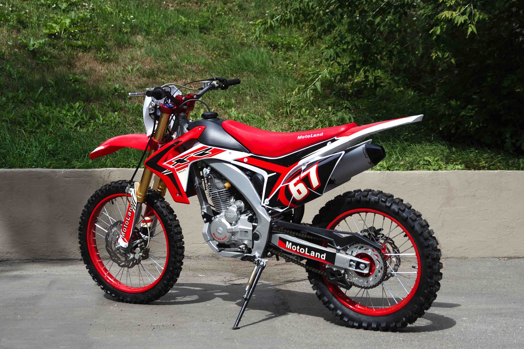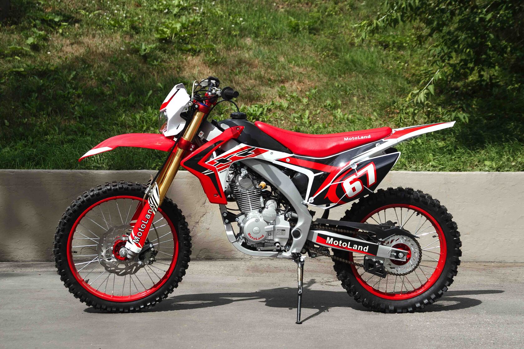 Купить Motoland 250 XR250 в стандартной комплектации будет неплохим решением для всех, кому нужен недорогой кроссовый мотоцикл, подходящий для езды по бездорожью, без выполнения прыжков и базовых трюков. Хорошее качество сборки и доступные цены на комплектующие позволяют поддерживать технику в исправном состоянии без больших затрат при любой интенсивности эксплуатации. Масса мотоцикла составляет порядка 130 кг. Габариты довольно большие – длина составляет 2000 мм., а высота по седлу – 920 мм., ширина руля- 830 мм. поэтому он отлично подойдет для тех, кто имеет рост от 175 см и выше.На мотоцикле установлен обычный для китайских кроссовых мотоциклов двигатель 169 FMM с 17 л.с. мощности, с воздушным охлаждением и рабочим объемом 230 кубов . Диаметр поршня движка составляет 65,5 мм, балансирный вал в конструкции не предусмотрен. Коленвал у мотоцикла Motoland XR 250 имеет палец диаметром 15 мм. Новые партии оснащаются карбюраторами PZ 30 с ускорительным насосом. Для удобства запуска мотора предусмотрен электростартер.Рычаги сцепления и тормоза – обычные, не складные. Передний тормозной диск имеет размер 280 мм., а размер заднего диска составляет 250 мм. Данный мотоцикл комплектуется колесами размерами 18/21 дюймов, размер задней покрышки – 110/90-18, передней- 80/100-21. Установлена 520-я цепь, передняя (ведущая) звезда имеет 13 зубов, задняя (ведомая) – 41 зуб.Подвеска у данной модели имеет стандартную прогрессию, как у большинства «китайцев». Размеры сальников прогрессии – 32х17х4, размеры подшипников – NK 17/16. Передние амортизаторы имеют размеры L=870 d51x55 мм., а задний – 460 мм, регулировки не предусмотрены. Задний маятник мотоцикла тоже стандартный, металлический.У модели Motoland XR 250 руль имеет переменное сечение: в месте установки его размер составляет 28 мм, а на концах под грипсами – 22 мм. Перевернутая вилка позволяет легче преодолевать любые неровности на дороге даже новичкам.Мотоцикл оснащен фарой головного света, что является необходимым условием для езды в сумерках и темноте. Если он покажется вам недостаточно ярким, вместо стандартной лампы можно установить LED освещение или Биксенон. Переключение света осуществляется ключом зажигания.