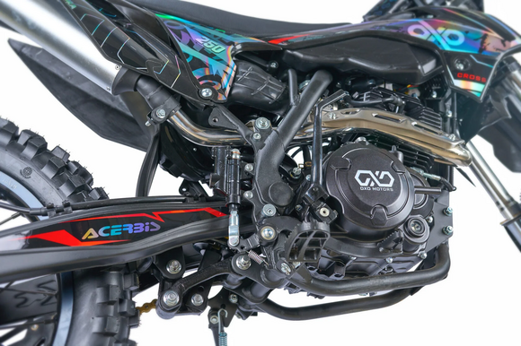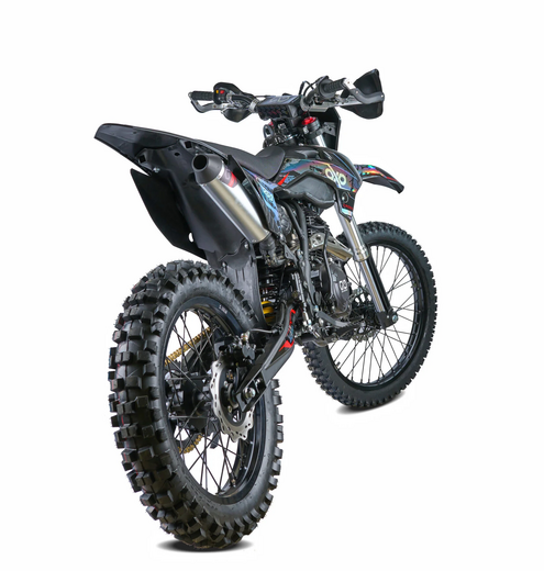 ДвигательМодель оснащена двигателем Zongshen 172FMM-3A с пятиступенчатой КПП. Особенностью двигателя, можно считать то, что данный двигатель является самым надежным среди серии моторов Zongshen.РамаРама мотоцикла OXO производится из труб шестигранного сечения хром-молибденовой стали, которая является очень прочной и легкой. Геометрия рамы, благодаря правильно выверенному центру тяжести и углу наклона вилки - способствует наилучшей управляемости устойчивости мотоцикла на низкой скорости.ПодвескаПередняя вилка перевернутого типа. Мотоцикл снабжен моноамортизатором, который соединен посредством системы рычагов прогрессии. Система прогрессии, обеспечивает равномерную, мягкую работу и увеличивает длину рабочего хода подвески.КолесаВ переднем и заднем колесах установлены антибуксаторы, которые притягивают покрышку к ободу, позволяя ездить по бездорожью при низком давлении в камерах, не давая покрышке проворачиваться во время езды. Размер передней покрышки: 80/100-21. Размер задней покрышки: 120/100-18. Они прекрасно себя ведут по песку и грязи, что позволяет райдеру отлично показать себя на пересеченной местности.Тормозная системаТормозная система мотоцикла - полностью гидравлическая с армированными шлангами. Спереди и сзади установлен двухпоршневой суппорт. Данная конфигурация тормозных механизмов, позволит быстро и безопасно остановиться с максимальной скорости даже на бездорожье.РульВажная часть современного эндуро мотоцикла - усиленный руль переменного сечения. На руле установлен рычаг заслонки подсоса. Алюминиевая ручка газа с коротким ходом имеет регулировку троса.