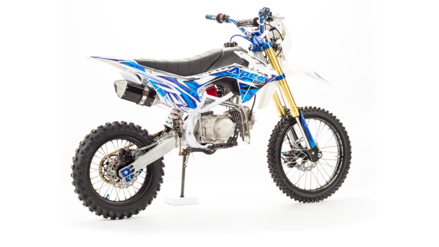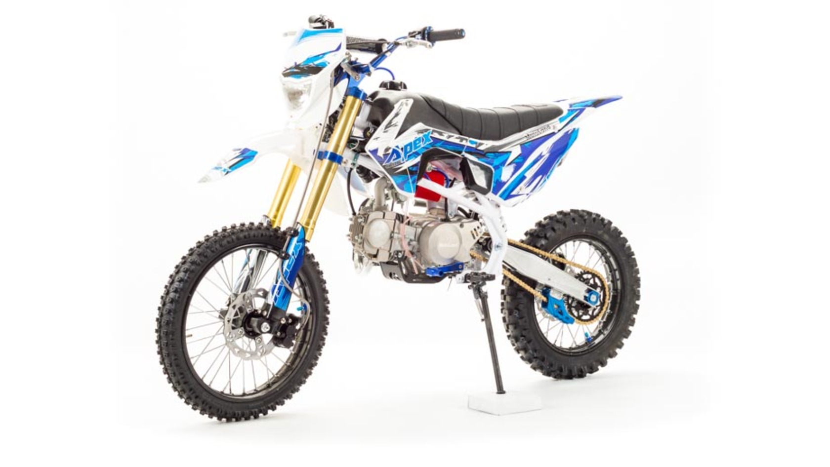 Недорогой надёжный питбайк APEX125 идеален для поездок по грунтовым дорогам и бездорожью. Хорошо чувствует себя на мягком и среднем грунте, разгоняется до 90 км/ч. Оснащён CNC траверсами, фарой, алюминиевыми ободами, весит всего 90 кг. Питбайк прост в управлении и не требует специального ухода, подойдёт как новичкам, так и любителям мотокросса.У кроссового мотоцикла APEX125 отличный узнаваемый дизайн. Конструкция подчёркивает неуступчивый спортивный характер питбайка, который не остановится ни перед одним препятствием. Пластик комбинированный, прочный, не ломается при сгибании. Кроссовый мотоцикл APEX125 доступен в красном и синем цвете, при этом в основной цвет окрашен не только пластик, но и обода колёс и другие детали питбайка.Передняя подвеска — телескопическая нерегулируемая вилка перевёрнутого типа, которая отлично подходит для преодоления ям, ухабов и других неровностей плохих дорог или их отсутствия. Задняя подвеска маятниковая с моноамортизатором. Руль 22 мм с высоким подъёмом и перекладиной удобен для мотоциклистов разного роста. Ручки руля — комфортные PRO TAPER. Питбайк оснащён складными рычагами сцепления и переднего тормоза, а также CNC-лапкой переключения передач.Питбайк весит всего 75 кг, при этом выдерживает вес до 150 кг. Оснащён CNC траверсами, рама полудуплексная стальная, мотоцепь качественная. Колёса спицованные, сделаны из прочного и лёгкого алюминия. Размер заднего колеса — 14 дюймов (350 мм), переднего — 17 дюйм (430 мм). Тормоза дисковые, передний тормозной суппорт двухпоршневой, задний — однопоршневой.Питбайк оснащён карбюратором с фильтром нулевого сопротивления VM22 MIKUNI и одноцилиндровым четырёхтактным двигателем с воздушным охлаждением. Надёжный мотор мощностью 9 л. с. и объемом 125 см³ разгоняет кроссовый мотоцикл APEX125 до 90 км/ч. Коробка передач механическая, четырёхступенчатая. Система зажигания электронная (CDI), для запуска двигателя можно использовать кикстартер.СверхпроходимостьПокрышки с шипами и высоким грунтозацепом идеальны для бездорожья. Мощность мотора и небольшой вес питбайка позволяют ему преодолевать значительные препятствия и непролазную грязь, хорошо заходить в подъёмы.Для поездок при низкой видимости и в ночное время суток питбайк оснащён фарой, которая включается при повороте замка зажигания (1 – выключить, 2 – включить, 3 – свет). Также в комплекте есть щиток для номера, который ставится вместо фары.Питбайк 125 относится к недорогим моделям, которые при должной эксплуатации работают без сбоев и капризов. Кросс неприхотлив в обслуживании, не занимает много места в гараже. При необходимости в нём легко сменить любую повреждённую деталь. Купить питбайк 125 вы можете в официальном магазине Мотолэнд, здесь же всегда можно приобрести запасные детали и комплектующие, которые стоят недорого и всегда есть в продаже. При покупке питбайка не забудьте о защитной экипировке.