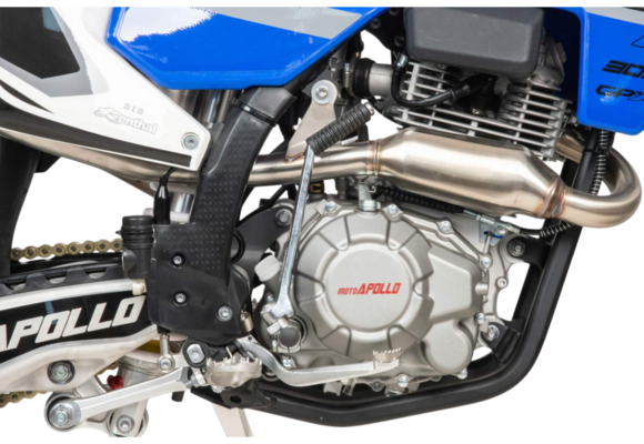 Moto Apollo F3 300 в этой конфигурации — это настоящий спортивный кросс, созданный без компромиссов для тех, кто живёт скоростью, прыжками и гонками по бездорожью. Несмотря на маркировку двигателя 175FMM, его реальный рабочий объём — 300 см³, а мощность составляет 25 лошадиных сил. Воздушное охлаждение, отсутствие балансирного вала и цепной привод ГРМ обеспечивают классическую кроссовую надёжность, минимальный вес и высокую ремонтопригодность прямо на трассе.