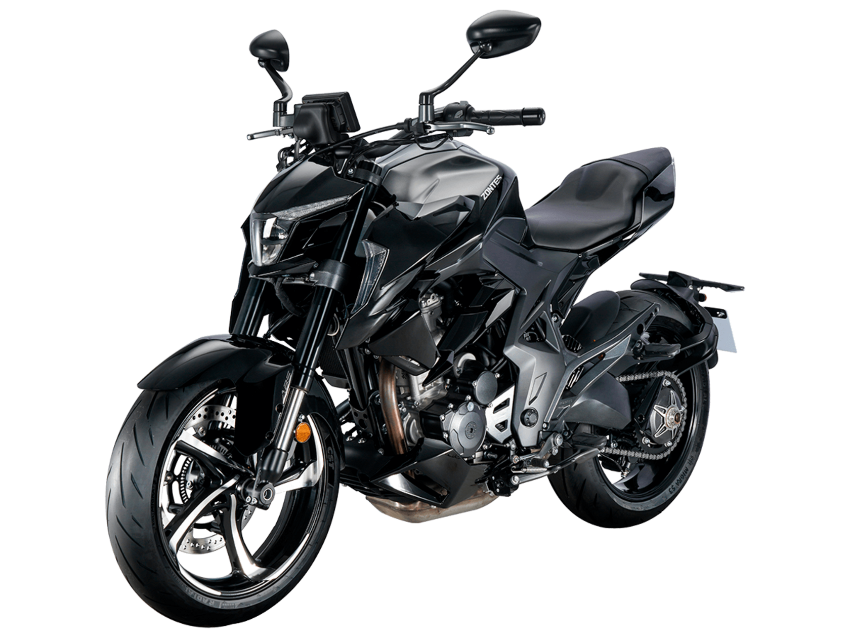 Мотоцикл ZONTES ZT350-R1 – современный нейкед со стремительным и дерзким дизайном. Хорошо подходит как для поездок в городской среде и маневрирования в межрядье.Силовая установка представлена одноцилиндровым 4-тактным двигателем ZT184MP с 4 клапанами и 2 верхними распредвалами. Двигатель имеет объём 348 см³ и обеспечивает мощность в 39 л.с. Оснащён инжектором BOSCH и системой жидкостного охлаждения. Механическая коробка передач имеет 6 ступеней и схему 1-N-2-3-4-5-6. Запуск двигателя осуществляется с помощью бесключевого доступа.Ёмкость топливного бака 15 литров.Колёса представлены литыми алюминиевыми дисками диаметром 17 дюймов. На мотоцикл установлены датчики давления в шинах, показатели от которых выводятся на приборную панель. Для подвески спереди используется телескопическая вилка, сзади – моноамортизатор. Гидравлические дисковые тормоза произведены испанской компанией J.JUAN, входящей в холдинг BREMBO.Для освещения используется яркая LED-оптика, а приборная панель представлена цифровым дисплеем. Рычаги тормоза, сцепления и лапки КПП можно отрегулировать. Имеется 2 USB-порта.Габариты мотоцикла 2030х795х1120 мм. Колёсная база 1390 мм. Высота по седлу 795 мм. Вес 165 кг.